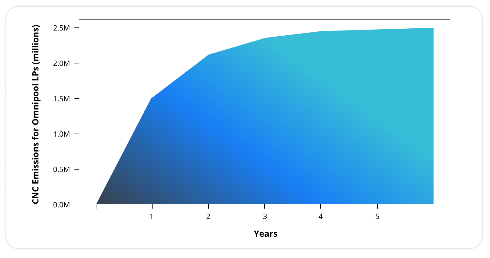 The yearly CNC emissions to Omnipool LP token stakers is shown below and decreases by 60% each year. The emissions start when Omnipools launch.